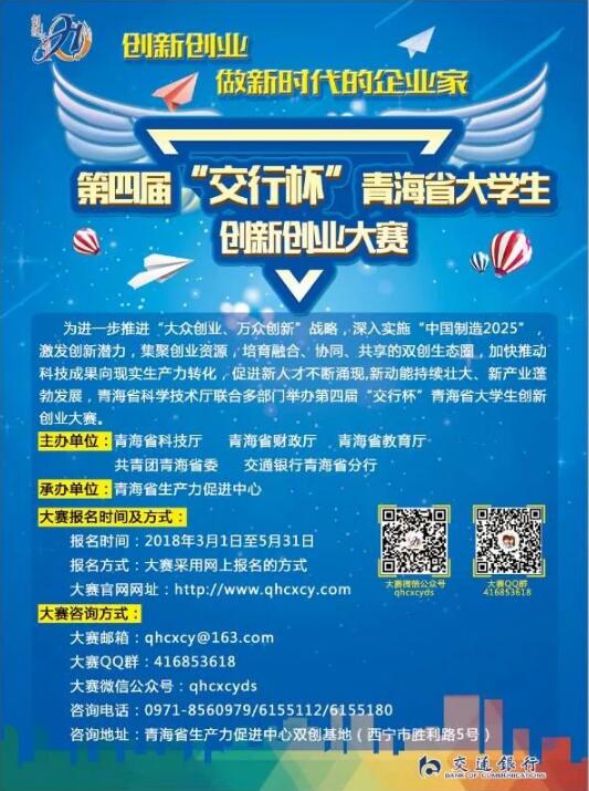 根據(jù)《第四屆“交行杯”青海省大學(xué)生創(chuàng)新創(chuàng)業(yè)大賽實(shí)施方案》的要求,3月1日起正式啟動(dòng)第四屆“交行杯”青海省大學(xué)生創(chuàng)新創(chuàng)業(yè)大賽報(bào)名工作,報(bào)名截