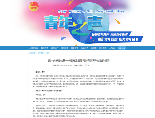 10月20日,團中央書記處第一書記秦宜智通過“青年之聲”互動社交平臺回答網友提問。網頁截圖 中國青年網北京10月20日電(記者 劉妍彤) “我為你們的青春夢想喝彩