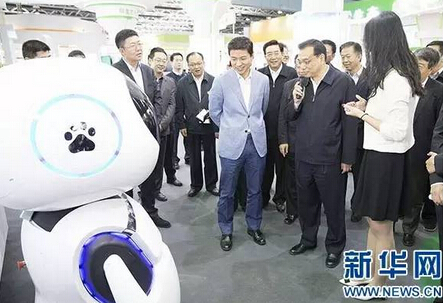 10月19日,中共中央政治局常委、國務院總理李克強在北京出席首屆“全國大眾創(chuàng)業(yè)萬眾創(chuàng)新活動周”,并考察主題展區(qū)。這是李克強在與百度公司自主研發(fā)的機器人交談。